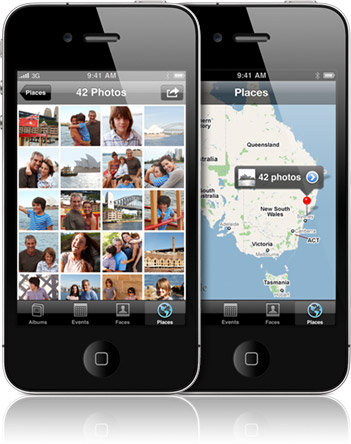 iPhone 4 geotagů vaše fotografie, jak jste si je. Takže se můžete procházet je založen na tom, kde byly pořízeny. Chcete-li zobrazit všechny fotografie jste se v Londýně, například, klepněte na tlačítko Místa, pak klepněte na kolík na Londýn. Dokonce si můžete zvětšit na mapě zobrazit místa v Londýně, kde jste fotili, jako je Trafalgar Square, Big Ben, nebo jiné orientační body.